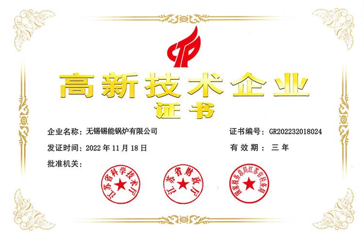 2023年2月23日,全国高新技术企业认定管理工作领导小组办公室,公布了《江苏省认定机构2022年认定的高新技术企业补充备案名单》。无锡锡能锅炉有限公司顺利通过“国家高新技术企业”复审认定。